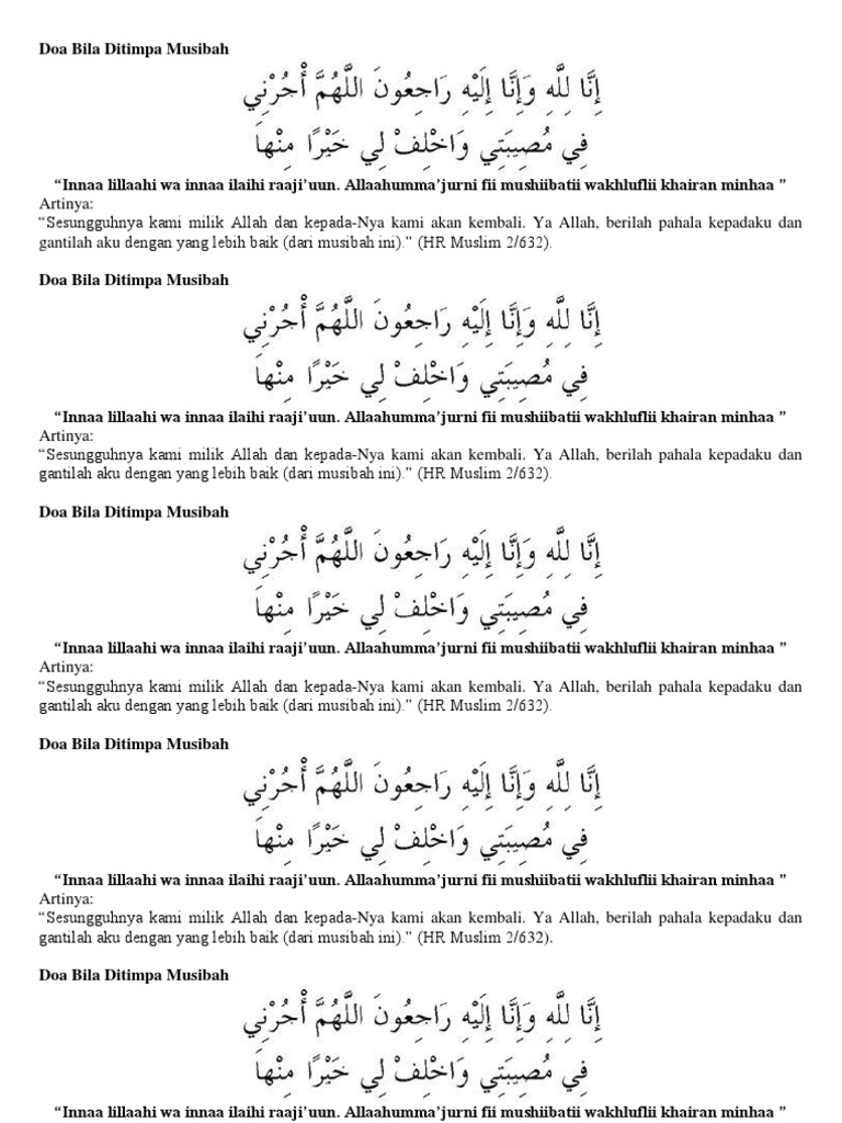 Inna lillaahi wa innaa ilaihi raaji'uun. Musibah atau anugerah selalu hadir dalam kehidupan manusia. Bacaan apabila ada sesuatu yang menyenangkan atau menyusahkan. Karena hal itu bisa saja sebagai ujian untuk meningkatkan derajat seseorang. Doa ketika di timpa musibah ustad. Jika senantiasa ditimpa musibah ustadz dr syafiq reza basalamah m a. Ya allah, berilah pahala kepadaku dan gantilah aku dengan yang lebih baik (dari musibah ini). Selengkapnya lafad doa tersebut adalah Musibah adalah diantara ujian bagi seorang muslim. Sebaliknya, apabila ditimpa musibah, ia akan banyak berdoa. Namun yang menjadi pertanyaan, bagaimana batas kesabaran saat ditimpa musibah? Tidaklah seorang hamba yang ditimpa musibah mengucapkan, inna lillahi wa inna ilaihi raji'un, ya allah berilah aku pahala dalam musibahku ini dan gantilah untukku dengan sesuatu yang lebih baik, kecuali allah akan memberikan pahala dalam musibahnya dan akan memberikan kepadanya ganti. Isi doa ini adalah permohonan kebaikan kepada allah dari musibah yang terjadi dan memohon perlindungan dari keburukannya.