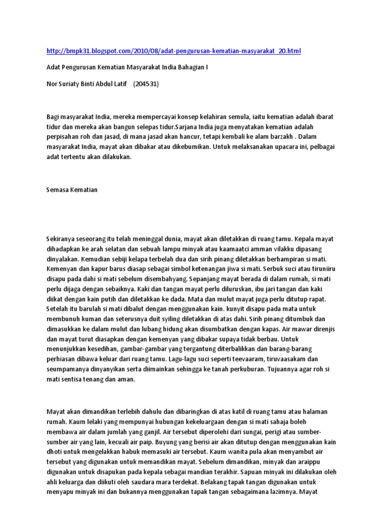 Upacara Kematian Kaum India - Upacara kematian / ngurus mayit dilakukan dariperawatan sampai penguburan dan disesuaikan dengan ajaran islam.