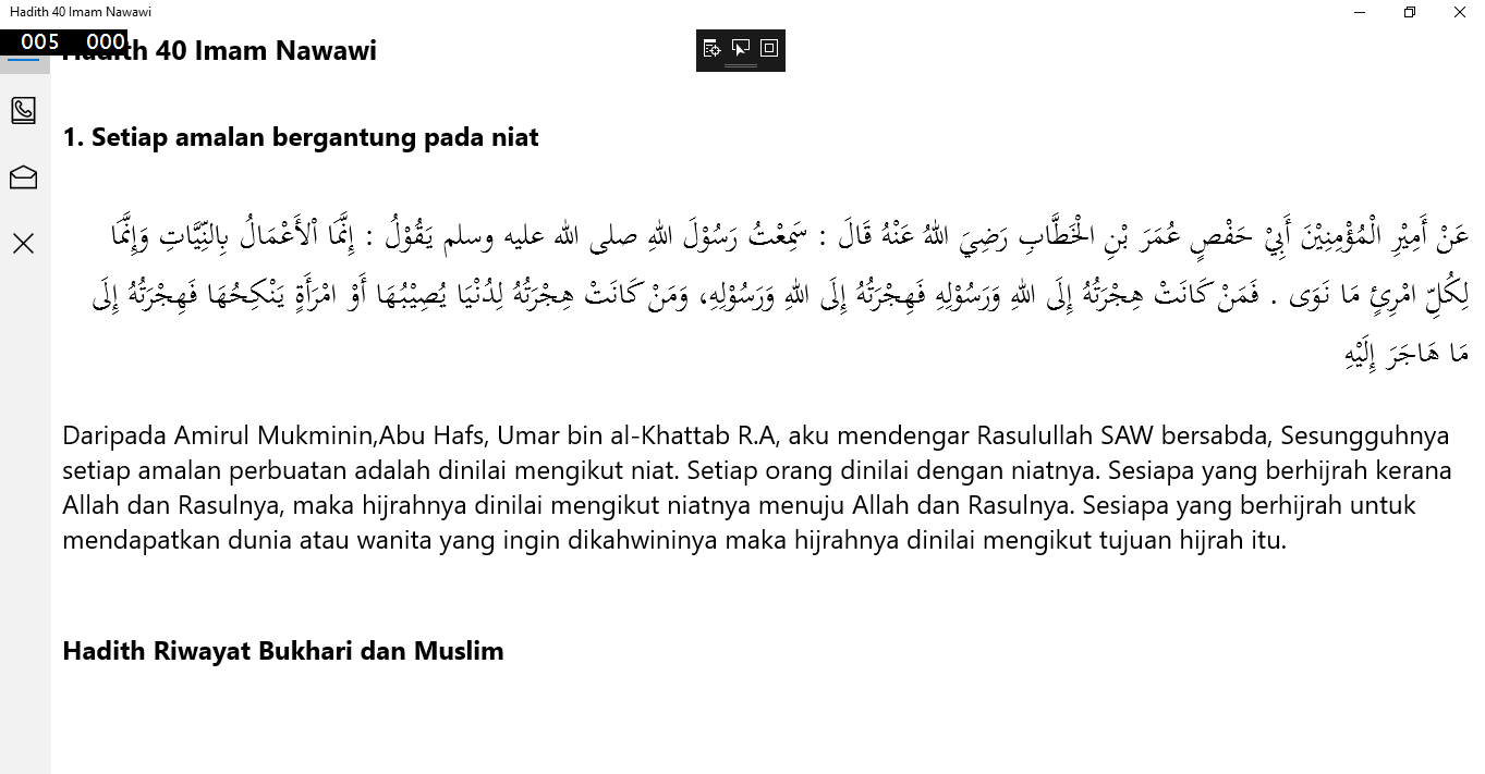 Semua persoalan dan huraian mengenai 40 hadis yang ditulis beliau ada terkandung didalam aplikasi kitab ini. Semoga dengan adanya aplikasi ini kita lebih mudah untuk membuat rujukan dan berdakwah. Semua persoalan dan huraian mengenai 40 hadis yang ditulis beliau ada terkandung didalam aplikasi kitab ini. Be in this world as a traveler. It is compatible with all android devices (required android 4.1+) and can also be able to. «kimki dinimizda asli yo'q bo'lgan narsani paydo qilsa, u albatta rad. Barangsiapa yang mempermudahkan bagi orang susah, nescaya allah akan mempermudahkan baginya di dunia dan di akhirat. Rasululloh sollallohu alayhi vasallam dedilar: Kuliah (video) hadith 40 imam nawawi bab niat (part 2) oleh ustaz salman ali. Buku hadis 40 imam nawawi ini adalah antara yang tersendiri dalam kelasnya di mana setiap satu daripada 42 hadis yang terkandung dalam himpunan hadis 40 ini diiringi dengan gambar foto, pemandangan, objek, artifak dan grafik untuk menguatkan isi dan hujah serta huraian hadis. 42 hadis yang dikumpulkan oleh imam nawawi, pada awalnya hanya 26 hadis yang dimuatkan dalam judul ibnu solah. Setiap hadis yang terpilih (di dalam koleksi hadis 40 ini) merupakan dasar agama ini, yang disifatkan oleh para ulama' sebagai tunggak islam, atau separuh dari islam, atau sepertiga darinya, atau hal yang seumpamanya. Beliau merupakan seorang ulama' tersohor didalam dunia.